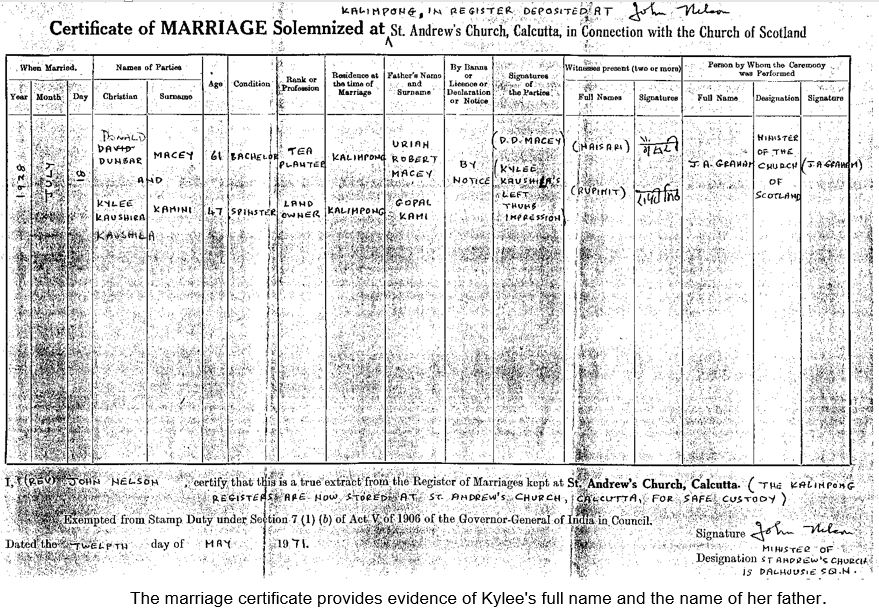 1867 Donald Dunbar Macey on 18 July 1928 in Kalimpong married Kylee Kaushira Kamini (daughter of Gopal Kamini)